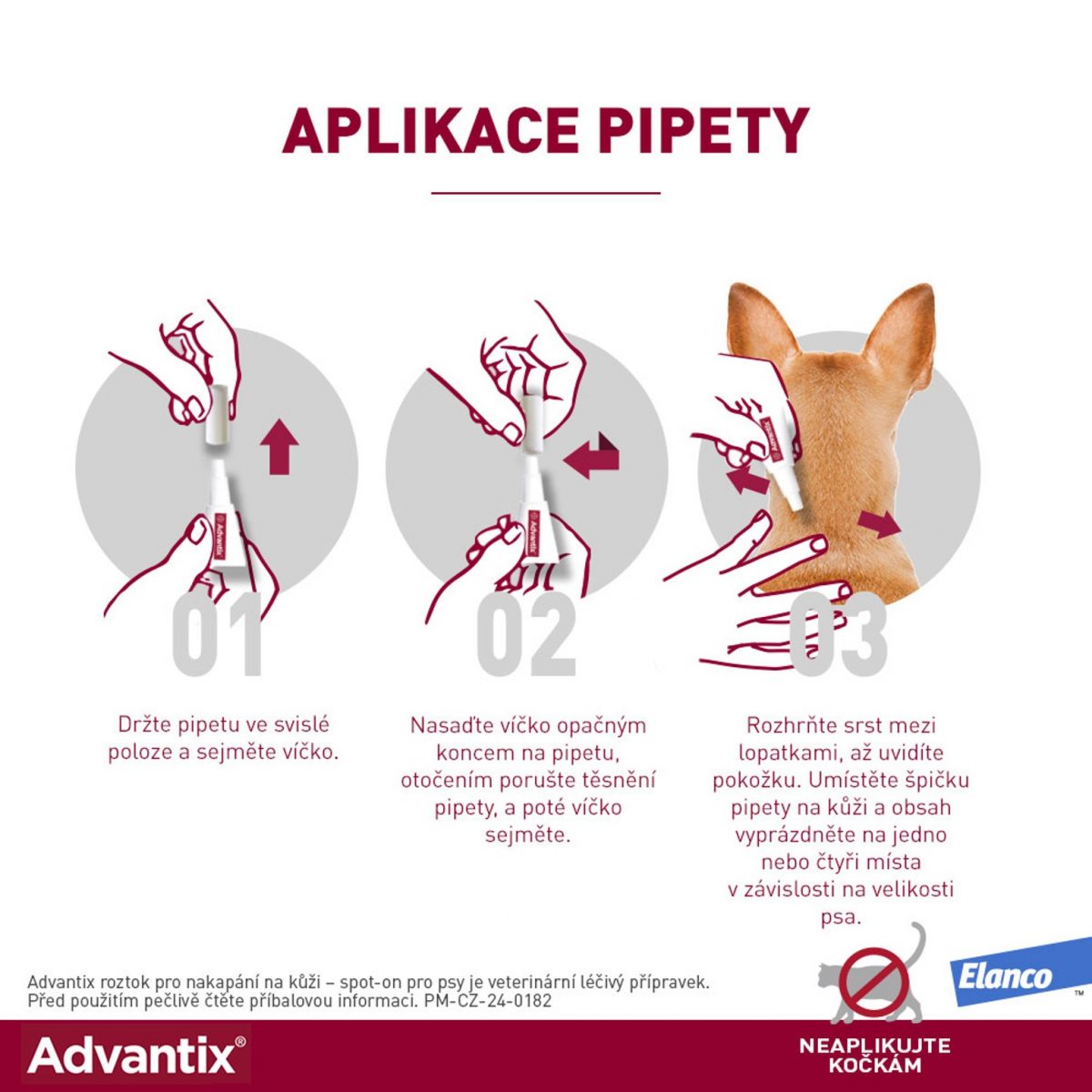 Celý obsah pipety Advantix by měl být rovnoměrně aplikován na kůži na 4 různá místa. Po aplikaci na kůži se rovnoměrně rozprostře po povrchu těla a vytváří ochrannou bariéru. Držte pipetu ve svislé poloze a sejměte uzávěr. Nasaďte víčko opačným koncem na pipetu, otočením porušte těsnění pipety, a poté víčko sejměte. Rozhrňte srst mezi lopatkami, přiložte pipetu přímo ke kůži a jemně stiskněte. Obsah pipety rovnoměrně rozdělte na čtyři místa podél hřbetu od ramen až ke kořeni ocasu. V každém bodě naneste část přípravku přímo na kůži. Před uvolněním stisku pipetu vždy lehce odtáhněte, aby se tekutina nevracela zpět.