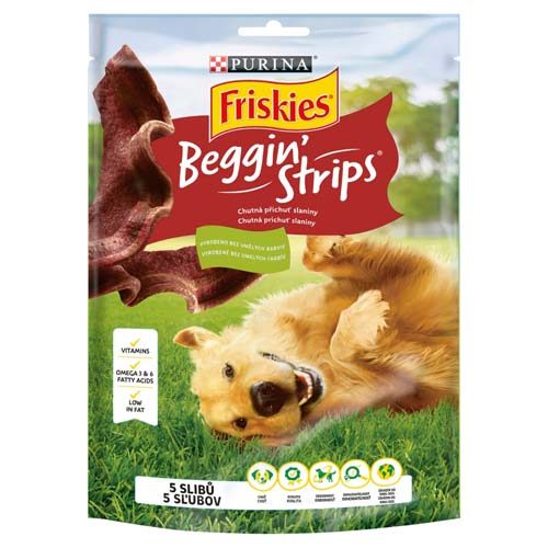 Friskies pochoutka pes Snack Beggin Strips bacon je pochoutka pro psy ke žvýkání s příchutí křupavé slaniny s nízkým obsahem tuku.