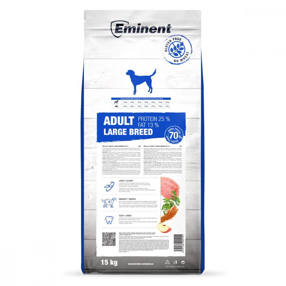 Optimální poměr bílkovin (25 %) a tuků (13 %) s vysokou stravitelností, správná minerální výživa s komplexem vitamínů a speciálních přídavků včetně chondroitinu a glukosaminu a chelátových forem (lépe stravitelných) vybraných minerálních prvků, zejména manganu, prospívají organismu psů velkých plemen.