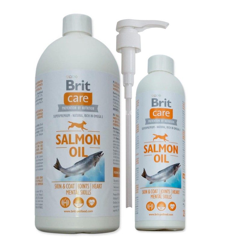 Brit Care Salmon Oil je přírodním doplňkem stravy pro psy v prvotřídní kvalitě. Za studena lisovaný olej z norských lososů napomáhá vybalancovat poměr Omega-3 a Omega-6 mastných kyselin. Superprémiový lososový olej řeší některé zdravotní problémy. Při pravidelném užívání lososového oleje Brit Care bude srst viditelné hustší a lesklejší. Nehrozí změna pigmentace. Lososový olej nepřebarvuje srst. Naopak podporuje její přirozené zbarvení.