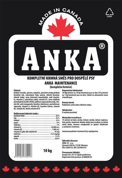 ANKA MAINTENANCE je špičková strava pro dospělé psy. Vysoký obsah všech důležitých složek ANKA MAINTENANCE přináší kompletní výživu v menších porcích - čímž se zmenšuje i objem stolice a následného úklidu.