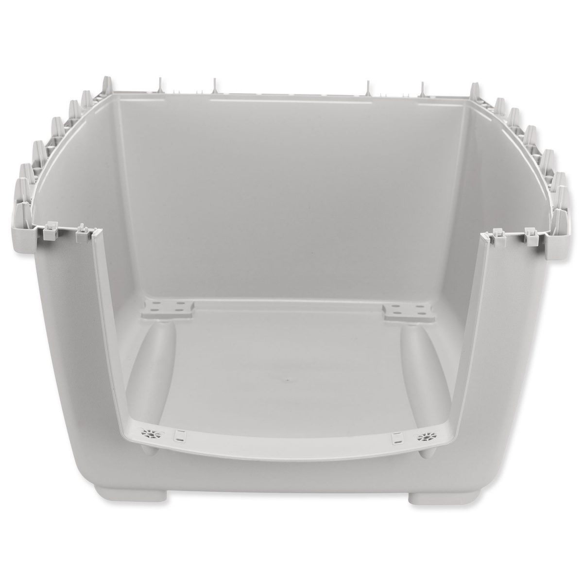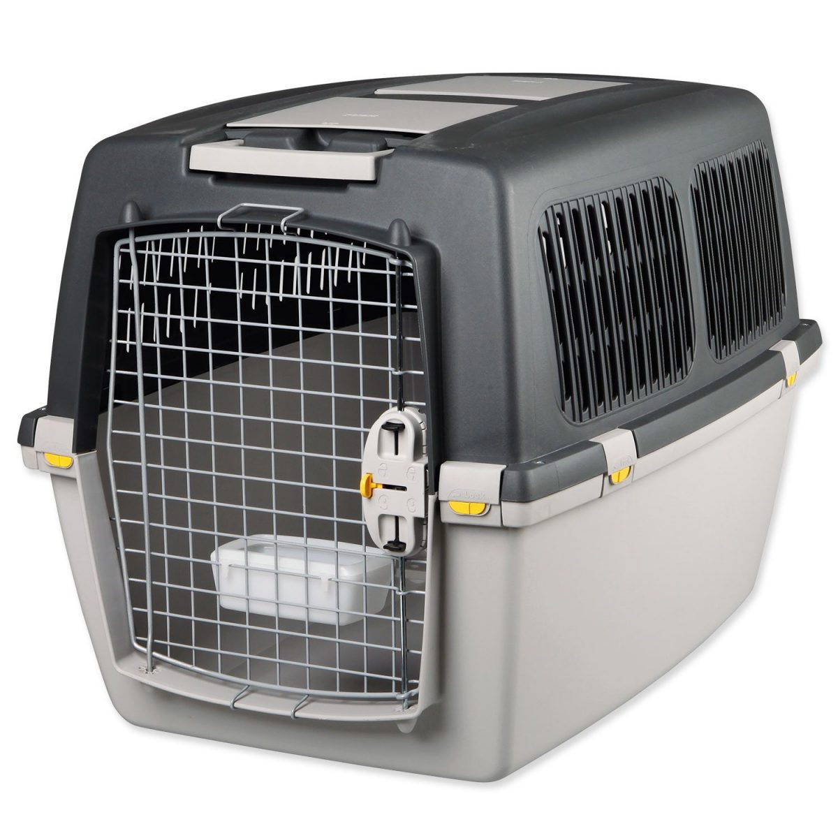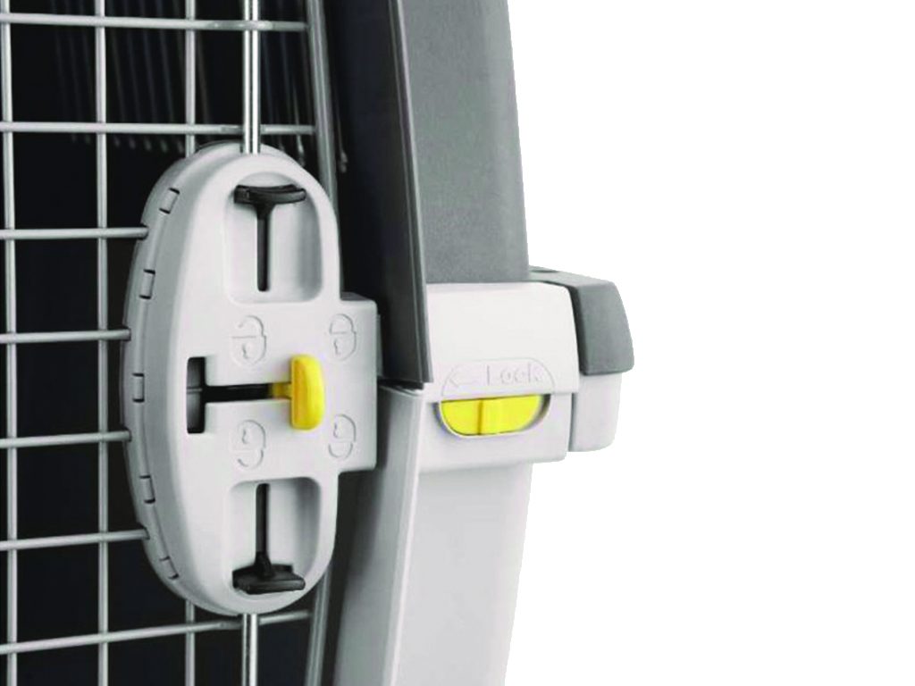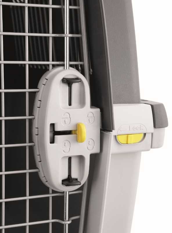 přenoska má kovová dvířka na kterých je upevněná miska