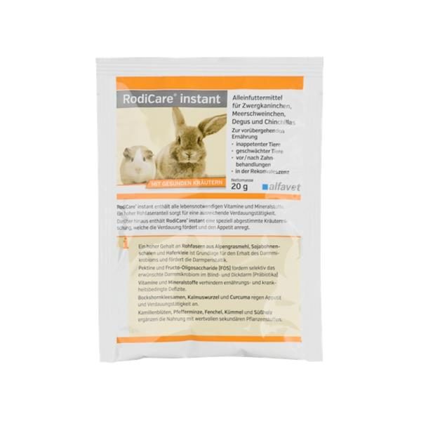 RodiCare Instant je hodnotné kompletní krmivo v práškové formě, určené pro morčata, králíky, činčily ale i pro rostlinami se živící plazy a ptáky, kteří přechodně nemohou přijímat pevnou stravu.