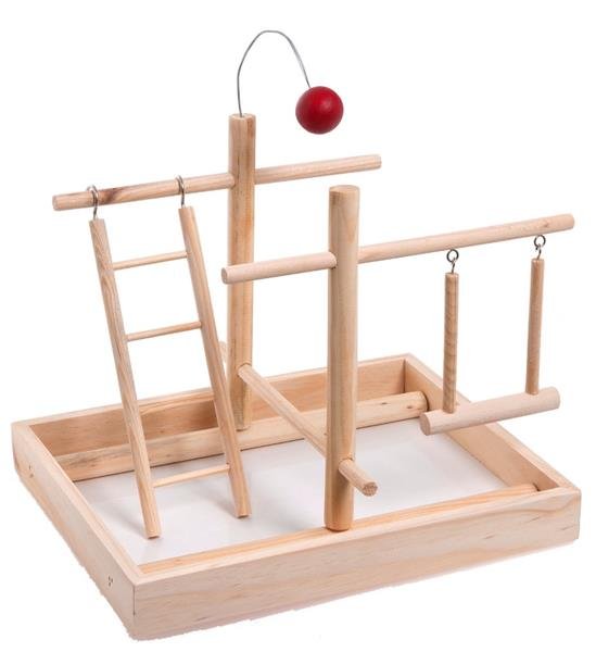Hračka hřiště. Andulky potřebují zábavu. Tato dřevěná hračka u nich vyvolá zájem. Obsahuje žebřík, houpačku a balónek.