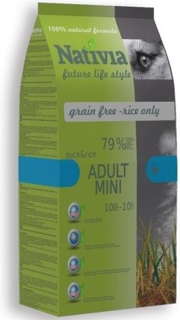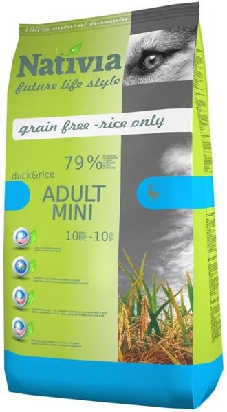 Receptura respektuje přirozené zákonitosti výživy psa. Obvyklá kombinace obilovin či brambor je zcela nahrazena pouze kvalitní rýží. Ta svojí stravitelností a profilem aminokyselin tyto tradiční suroviny převyšuje, nezatěžuje organismus a společně s ostatními komponentami výrobku zajistí zdravou výživu psa. Nativia Adult mini v řadě Duck&rice obsahuje 79% bílkovin živočišného původu a řadí se tak mezi přední značky na trhu.