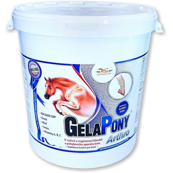 Koncentrované doplňkové krmivo s vysokým obsahem kolagenu CHP a vitamínů k regeneraci kloubního systému koní. Gelapony Arthro je koncentrované doplňkové krmivo s vysokým obsahem kolagenu CHP a vitamínů. Gelapony Arthro regeneruje tkáně kloubního systému, posiluje kosti, vazy a šlachy.