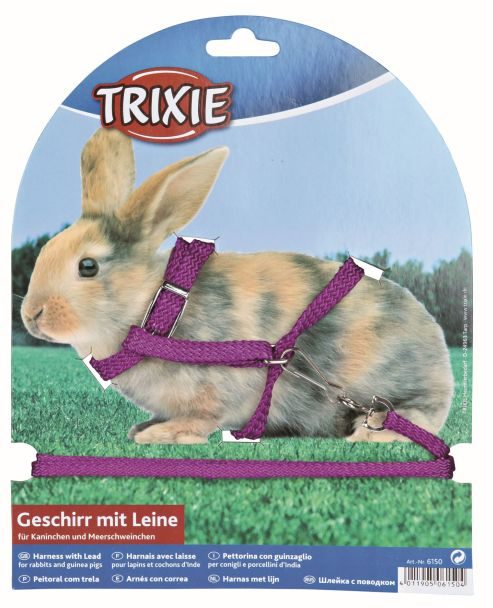 Nastavitelný nylonový postroj s vodítkem pro králíky. Různé barvy. Velikost: 25 - 44 cm, šířka 1 cm, délka vodítka 1.25 m. S rychlouzávěry.