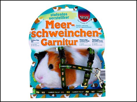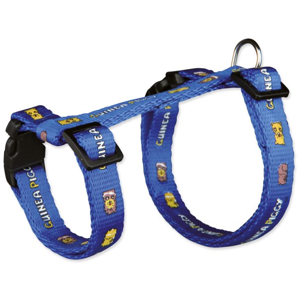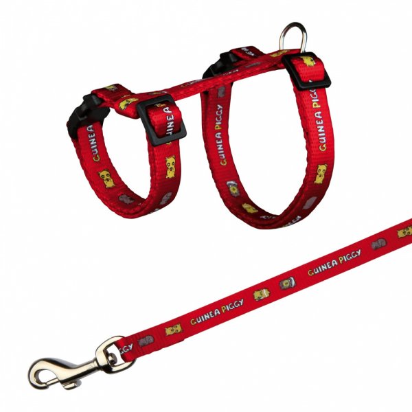 Nastavitelný nylonový postroj s nášivkou a vodítkem pro morčata. Různé barvy. Velikost: 21 - 35 cm, šířka 1 cm, délka vodítka 1.25 m.