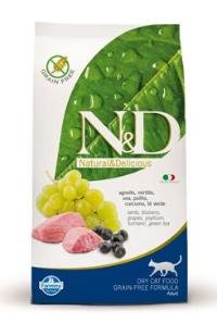 N&D Lamb & Blueberry (Jehně s borůvkami) - feline formula Kompletní krmivo pro dospělé kočky Složení: Čerstvé vykostěné jehněčí (28%), sušené jehněčí maso (26%), brambory, živočišný tuk, sušená celá vejce, čerstvý herring, sušený herring, rybí olej, hydrolyzované živočišné bílkoviny, vláknina z hrášku, sušené mrkve, sušená vojtěška, inulin, fruktooligosacharidy, mannanoligosacharidy, prášek z borůvek (0,5%), sušený sladký pomeranč, sušená jablka, prášek z granátových jablek, prášek ze špenátu, psyllium (0,3%), prášek z černého rybízu, chlorid sodný, sušené pivovarské kvasnice, kořen kurkumy (0,2%), glukosamin, chondroitin sulfát, extrakt z afrikánu (zdroj luteinu). Aditiva na 1kg: Výživové přísady: Vitamín A 18000 MJ, Vitamín D3 1200 MJ, Vitamín E 600 mg, Vitamín C 300 mg, Niacin 150 mg, kyselina pantothenová 50 mg, Vitamín B2 20 mg, Vitamín B6 8,1 mg, Vitamín B1 10 mg, Vitamín K 1,5 mg, Vitamín H 1,5 mg, kyselina listová 1,5 mg, Vitamín B12 0,1 mg, cholin 2500 mg, betakaroten 1,5 mg, chelát zinku analogické metioninové hydrolázy 910 mg, chelát manganu analogické metioninové hydrolázy 380 mg, chelát železa analogické metioninové hydrolázy 250 mg, chelát mědi analogické metioninové hydrolázy 88 mg, selenometionin 0,4 mg, DL-Metionin 5000 mg, taurin 4000 mg, L-karnitin 300 mg. Organoleptické přísady: Extrakt z aloe vera 1000 mg, extrakt ze zeleného čaje 100 mg, extrakt ze zrníček hroznů 100 mg. Antioxidanty: extrakt z rozmarýnu Analytické složky: Hrubý protein 42%, čisté tuky a oleje 20%, hrubá vláknina 1,8%, popel 8,9%, vápník 1,5%, fosfor 1,3%, hořčík 0,11%, Omega-6 3,4%, Omega-3 0,9%, DHA 0,5%, EPA 0,3%, glukosamin 1200 mg/kg, chondroitin 900 mg/kg. Energická hodnota: ME 3915 kcal/kg - 16,4 MJ/kg. Návod k použití: Krmná dávka: viz tabulka. Vaše kočka musí mít vždy k dispozici misku čisté vody v průběhu celého dne. Uvedená množství jsou doporučené denní dávky v gramech, je možné, že dávka se bude muset přizpůsobit potřebám vaší kočky. Je doporučeno ze začátku míchat N&D s předchozí používanou stravou. Skladujte na chladném a suchém místě v uzavřeném balení. Vyrobeno 18 měsíců před datem spotřeby vytištěným na balení. Net hmotnost, datum spotřeby, šarže a registrační číslo jsou uvedeny na zadní části obalu. Výrobce: FARMINA PET FOODS DOO, Save Kovačeviča bb, 22320 Indjija, Srbija Distributor: NOVIKO s.r.o., Palackého třída 163, 612 00 Brno