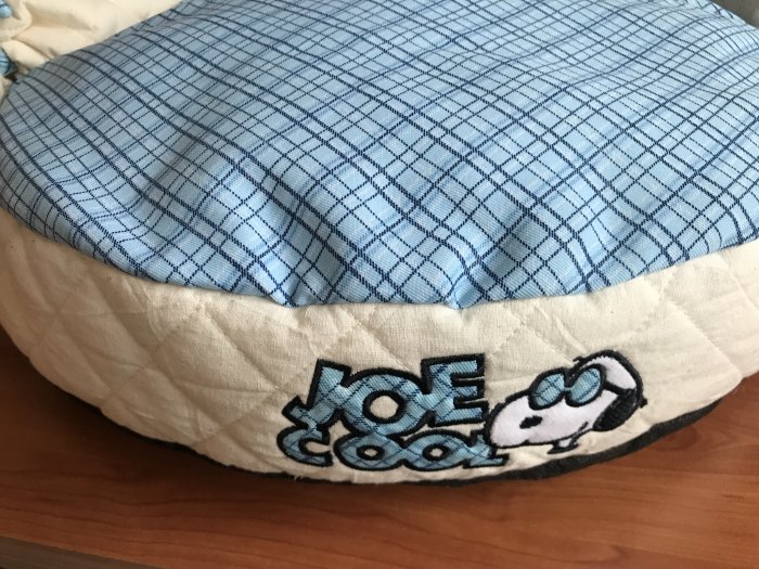 Měkoučký oválný pelíšek pro psy s motivem Snoopy, umělá nadýchaná výplň. Jedná se o vystavený kus ve výprodeji.
