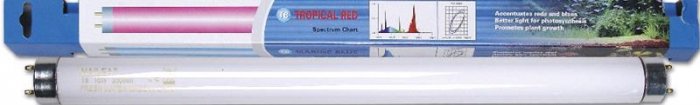 Hailea zářivky Tropical Red model T8 s důrazem na červené a modré spektrum pro podporu fotosyntézy.