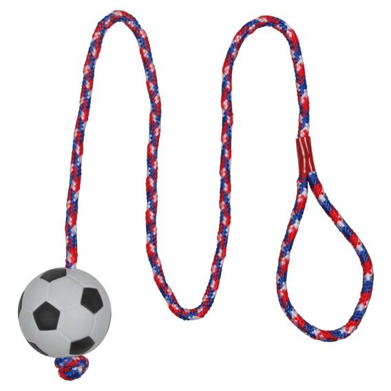 Vrhací míč z mechové gumy na dlouhé šnůře pro psy.