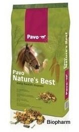 Pavo Nature´s Best je extrémně chutné na strukturu bohaté muesli s kousky mrkve, pšenicí špaldou a na slunci sušené vojtěšky. Tyto složky v Pavo Nature´s Best stimulují přirozené žvýkání vašeho koně nebo pony. Je to kompletní (ve smyslu obsahuje vše potřebné) doplňkové (ve smyslu doplněk k objemnému krmivu) energetické krmivo s optimálním složením přírodních složek, vitaminů, mikroprvků a minerálních látek. Pavo Nature´s Best neobsahuje oves, má velmi nízký obsah dusíkatých látek a není přidaný cukr, protože neobsahuje melasu. Proto je Pavo Nature´s Best velmi vhodné pro koně, kteří mají přirozeně „horkou hlavu“ nebo pro koně a pony, kteří mají sklon ke schvácení kopyt.
