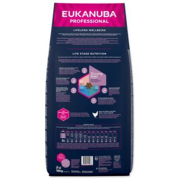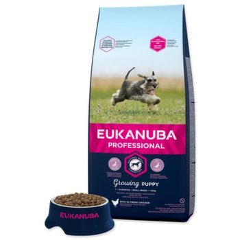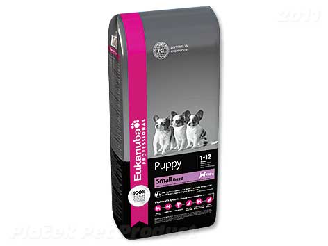 Kompletní krmivo pro štěňata malých plemen od 1 do 12 měsíců s váhou do 10 kg v dospělosti. Doporučuje se také pro březí a kojící feny. S bohatým obsahem kurecího masa. Štěňata malých plemen spalují více kalorií a potřebují více energie na kilogram tělesné hmotnosti než štěňata větších plemen. Tato strava Eukanuba dodává optimální množství proteinů, tuku a karbohydrátů na pokrytí těchto nároků. Poskytuje všechny důležité vitamíny a minerály nezbytné pro optimální růst. Obsahuje přísady vysoké kvality a velké množství živočišných proteinů, z nichž kuřecí maso představuje hlavní zdroj.