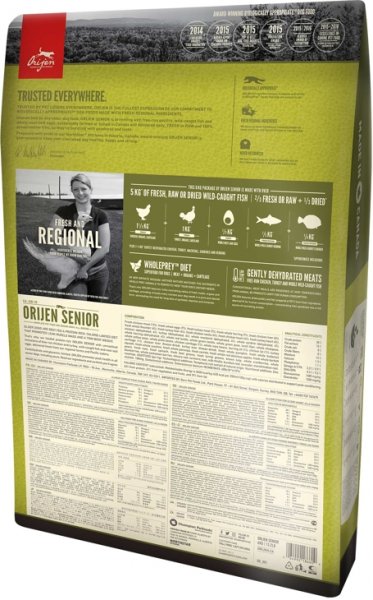 Krmivo je vytvořeno tak, aby odpovídalo přirozené stravě starších psů. Krmivo ORIJEN SENIOR obsahuje velké množství proteinů z živočišných surovin (80%), pro které matka Příroda vyvinula všechny psy. Obsahuje velký podíl kuřat a krůt z volných výběhů, celá vejce a ryby – chovány a loveny v našem regionu a dodávány ČERSTVÉ každý den, bez konzervačních prostředků a překypuje proteiny a tuky, které kompletně vyživují vašeho staršího psa. Omezené množství sacharidů a zcela bez obilovin tak, aby byla napodobena přirozená strava. ORIJEN SENIOR obsahuje zdraví prospěšné místní ovoce, zeleninu a byliny – květy měsíčku lékařského, lístky máty peprné a kořen smetanky lékařské – přirozeně bohaté na fytoživiny, vitamín B a minerály. Vyrobeno exkluzivně v naší již mnohokrát oceněné továrně zde v Albertě, v Kanadě. Krmivo ORIJEN SENIOR udržuje vašeho staršího psa zdravého, šťastného a silného. Přečtěte si naše složení a zcela jistě nám dáte za pravdu.