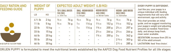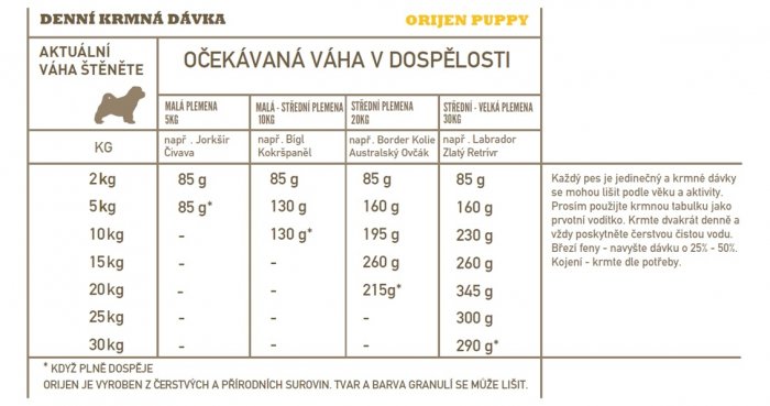 ŠTĚŇATA JSOU OD PŘÍRODY MASOŽRAVCI, COŽ ZNAMENÁ, ŽE JIM VYHOVUJE STRAVA BOHATÁ NA RŮZNÉ DRUHY MASA A MENŠÍ MNOŽSTVÍ OVOCE, ZELENINY A TRAVIN. Krmivo je vytvořeno tak, aby odpovídalo přirozené stravě štěňat. ORIJEN PUPPY kopíruje zdravou a rozmanitou vyváženost masa, ovoce, zeleniny a travin, které dokonale podporují růst štěňat a mladých psů. Každá granule je doslova nabita výživnými živočišnými surovinami (80%), pro které matka Příroda vyvinula všechna štěňata. ORIJEN obsahuje kuřata a krůty z volných výběhů, celá vejce a ryby, které jsou vypěstovány nebo uloveny v našem regionu a dodávány ČERSTVÉ – tudíž jsou bez jakýchkoliv konzervačních prostředků, nikdy mražené a plné proteinů a tuků, které kompletně vyživují vaše štěně. Omezené množství sacharidů a zcela bez obilovin tak, aby byla napodobena přirozená strava. ORIJEN PUPPY obsahuje zdraví prospěšné místní ovoce, zeleniny a byliny – kořen lékořice, květy měsíčku lékařského a sladký fenykl – suroviny, které jsou přirozeně bohaté na fytoživiny, vitamín B a minerály. Vyrobeno exkluzivně v naší již mnohokrát oceněné továrně zde v Albertě, v Kanadě. Krmivo ORIJEN PUPPY udržuje vaše štěně zdravé, šťastné a silné. Přečtěte si naše složení a zcela jistě nám dáte za pravdu.