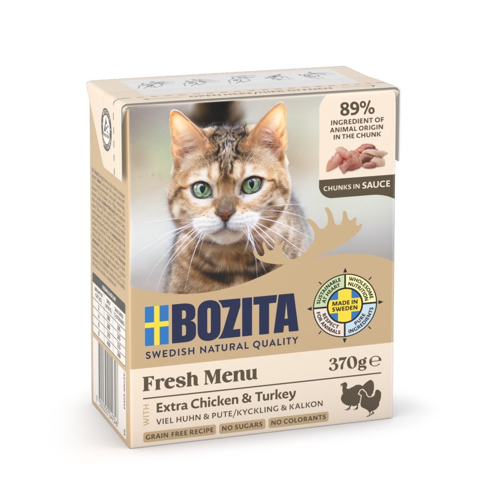 Kompletní krmivo pro kočky i koťata. Kousky v omáčce obsahují vysoký podíl čerstvého švédského masa (93%), jsou bezlepkové s nízkým obsahem tuku a mají přirozeně vysoký obsah taurinu pro kočičí oči a reprodukci. MacroGard, přírodní ß-Glukan, přispívá ke zlepšení imunitního systému.