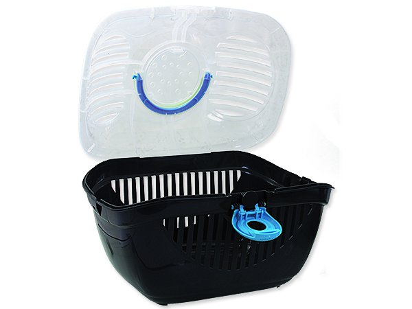 Plastová přepravka s průhledným vrchním dílem a madlem. Velikost: 48 x 36 x 32 cm.