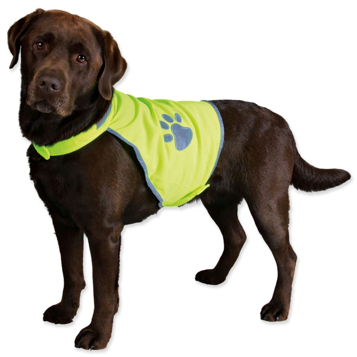 Trixie Reflexní vesta má reflexní pruhy na bocích, zádech a kolem krku. Vesta je neonově žlutá a má ještě reflexní okraje a tlapku.