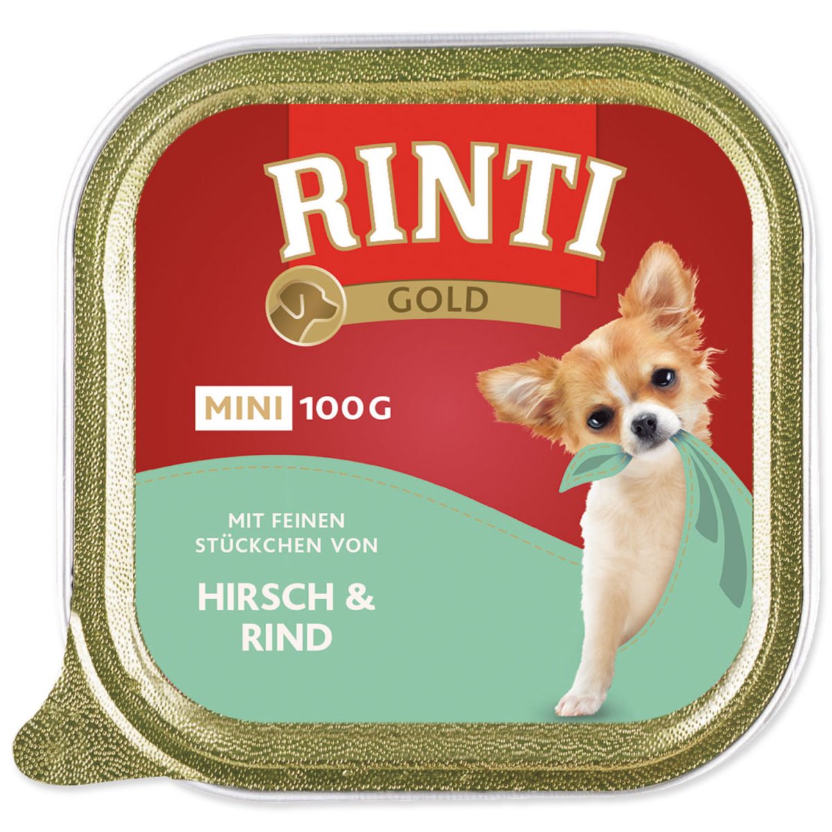 Paštika RINTI GOLD Mini jelen a hovězí je kompletní krmivo pro dospělé psy. Obsahuje šťavnaté kousky masa z jelena a hovězího. Při vložení zboží do košíku se automaticky načte minimální objednatelné množství 7 ks.