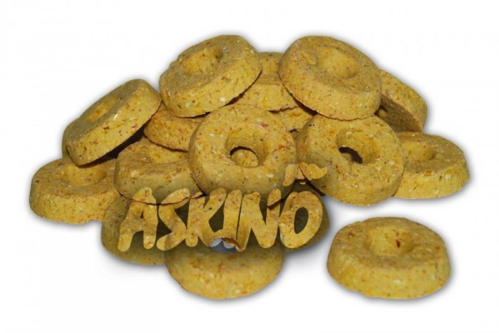 Kukuřičné kolečko. Složení: obiloviny, minerály, oleje a tuky Přísady: oxid železitý 0,03%, máslové aroma Analytické složení: Protein 9,03%, tuk 9,08%, popel 5,17%, vláknina 2,38%, sodík 0,40%.