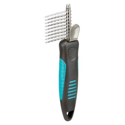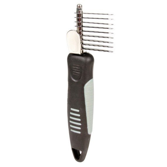 Vynikající bezbolestný způsob, jak odstranit cumle chlupů ze srsti dlouhosrstých koček. Pokud jsou cumle chlupů moc velké a nejdou prořezávačem odstranit, použijte nůžky. Hřeben je zoubkovaný, protiskluzový, s ochranou palce.