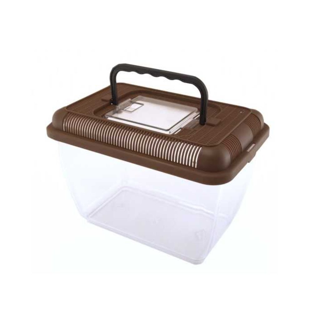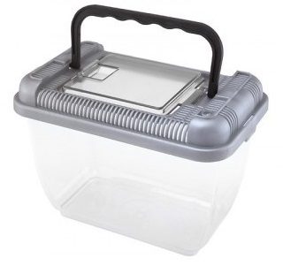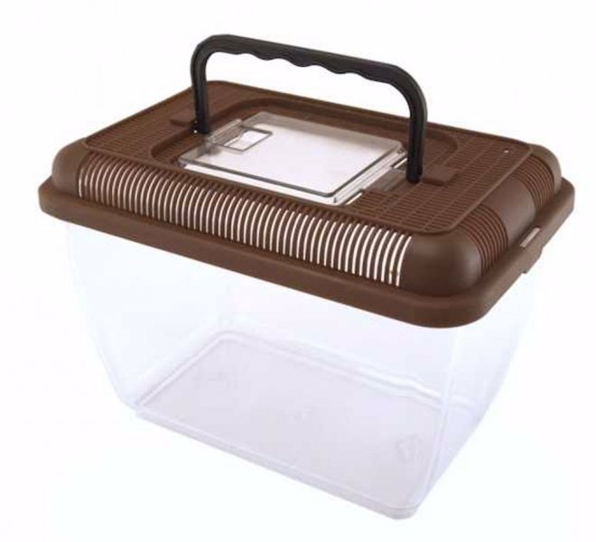 Lehky přenosný box pro terarijní zvířata, s větracími otvory ve vrchní části.