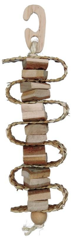 Závěsná hračka pro ptactvo z přírodních materiálů - sláma a dřevo s kůrou. Na konci hračky je zvoneček.