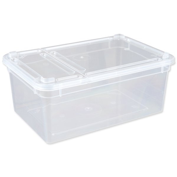 Plastový všestranný průhledný box pro terarijní použití. Výklopné víko rozdělené na 2 části.
