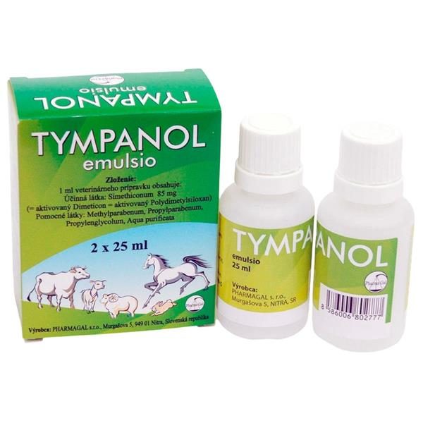 CHARAKTERISTIKA přípravku Tympanol: Tympanol je přípravek s obsahem polydimethylsiloxanu (Dimeticon), aktivovaného koloidním oxidem křemičitým ve formě emulze jako účinný prostředek při plynatosti a jako činidlo zabraňující pěnění, založený na rozrušování pěny ovlivňováním povrchového napětí. Způsobuje splývání plynových bublinek a usnadňuje tak odchod plynů.