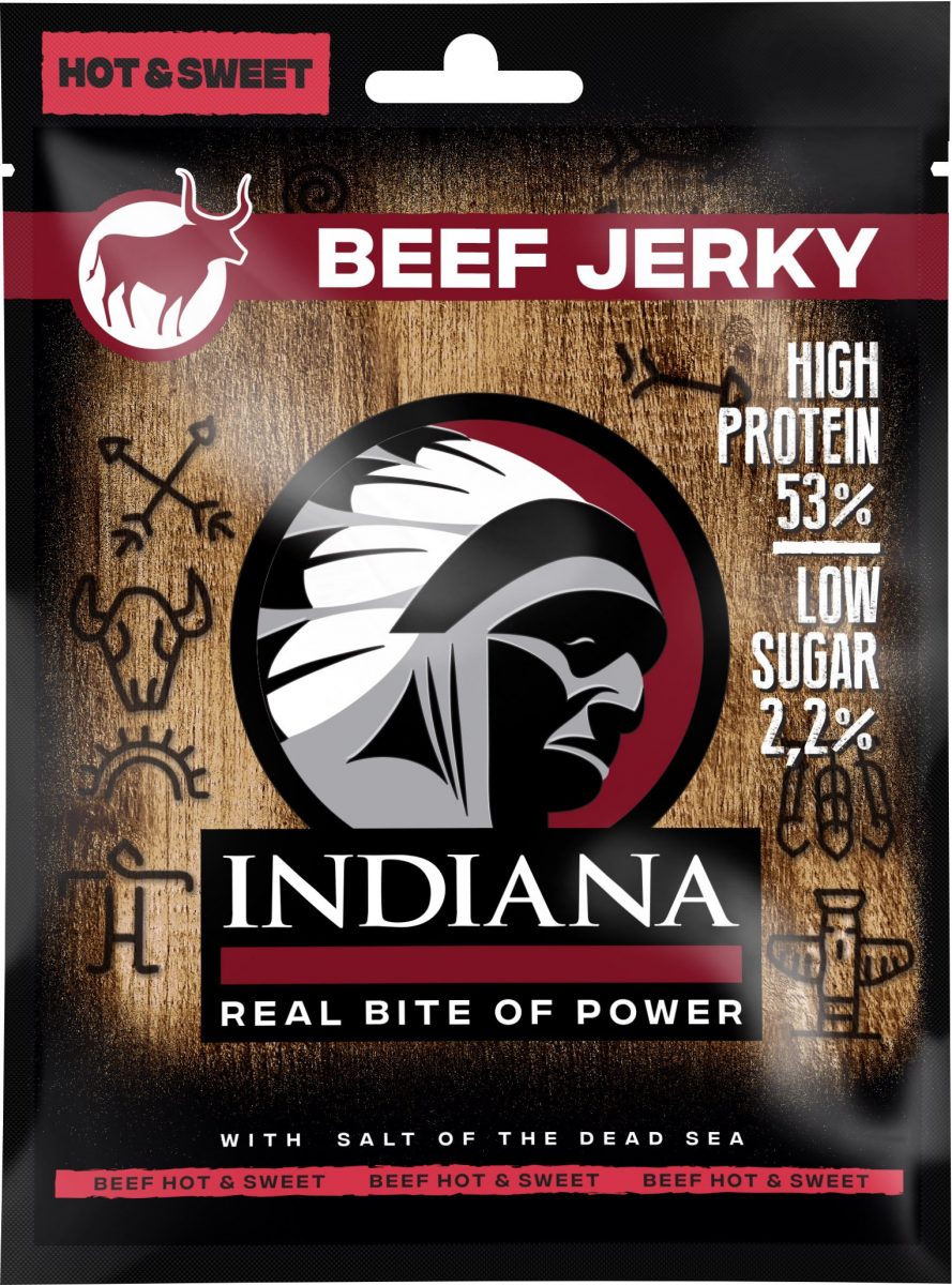Indiana Jerky je sušené maso vyrobené podle starých indiánských receptur nejnovějšími technologiemi přizpůsobené chuťovým buňkám Evropanů.