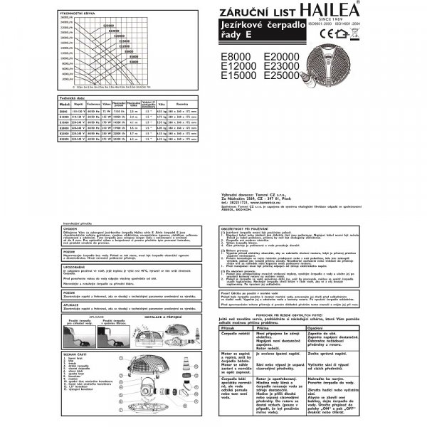 - schopnost čerpat vodu s nečistotami o zrnitosti až do 8 mm Technická data: