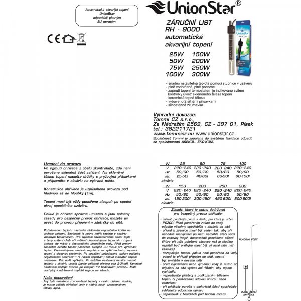 Zapnutí topení termostatem je indikováno svitem kontrolky uvnitř skleněného tělesa topení. Keramická topná tělesa. Vybaveno dvěmi silnými přísavkami. Silnostěnná zkumavka. Topítka RH-9000 mají tu zvláštnost, že stupnice zadávané teploty je umístěna svisle uvnitř průhledného pouzdra topítka. Konstrukce ohřívače je uzpůsobena provozu pod hladinou až do hloubky 1 m – absolutně uzavřené celoponorné a plně automatické topítko – topítko lze nainstalovat v jakémkoliv úhlu – snadno nastavitelný termostat Technická data: RH-9000 25 W, vel. akvária: 20 - 40 l RH-9000 50 W, vel. akvária: 40 - 60 l RH-9000 75 W, vel. akvária: 60 - 90 l RH-9000 100 W, vel. akvária: 90 - 150 l RH-9000 150 W, vel. akvária: 150 - 300 l RH-9000 200 W, vel. akvária: 300 - 450 l RH-9000 250 W, vel. akvária: 450 - 600 l RH-9000 300 W, vel. akvária: 600 - 800 l