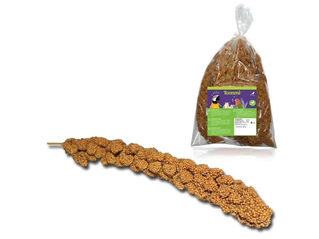 Ideální a chutné krmivo pro pro malé i velké papoušky, ostatní exoty i jiné ptactvo. Vhodné také pro hlodavce, bohaté na minerály a vitamíny ve formě klasů. Posyktuje ptákům zábavu a přirozený způsob krmení, zároveň slouží pro ozdobu klece. Senegalské proso v klasech k ozobu klece. Vhodné jak pro drobné hlodavce také i pro malé papoušky. Balení: 200 g