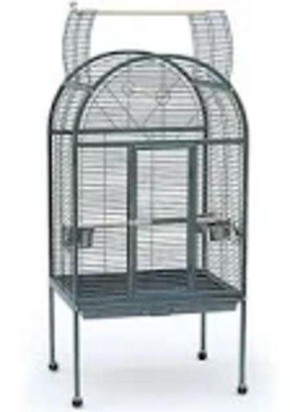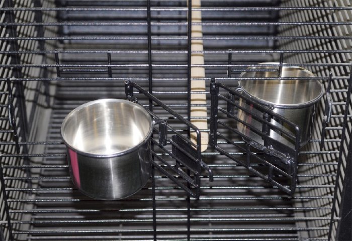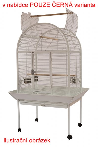 Snadno obslužná nerezová krmítka vně klece. Dřevěná bidla součástí výrobku. Konstrukce na kolečkách. Výsuvné dno.