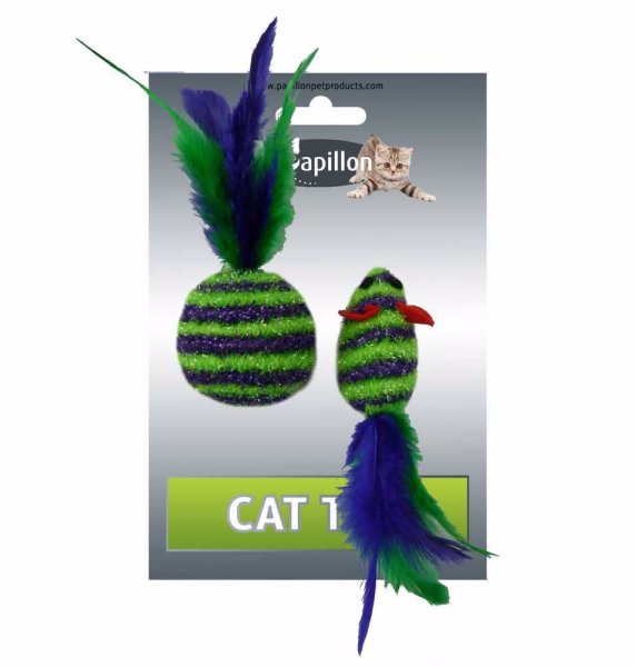 Hračky s peřím určená pro kočky. Vnitřní kostrukce - dutý plast, povrch pletená šňůra.