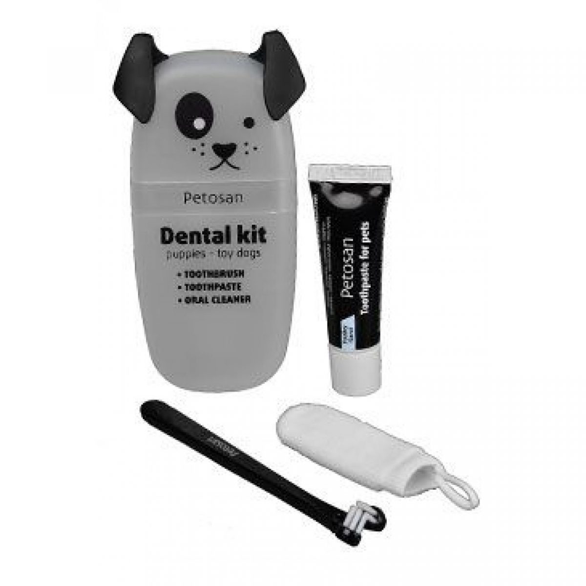 Toto praktické a atraktivní balení obsahuje zubní pastu 20g, zubní kartáček na prst z mikrovlákna a dvouhlavý zubní kartáček perfektně přizpůsobený malým zoubkům Vašeho štěňátka Box z omyvatelného a odolného plastu