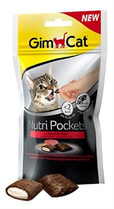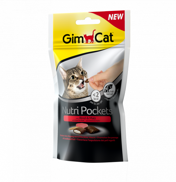 GimCat Nutri Pockets jsou křupavé polštářky s lahodnou náplní. Varianta s hovězím masem a maltózovou pastou obsahuje přírodně čistý aromatický slad a ovesnou vlákninu. Slad podporuje metabolizmus potravy a přirozené vylučování spolykaných vlasů a nestravitelných složek.
