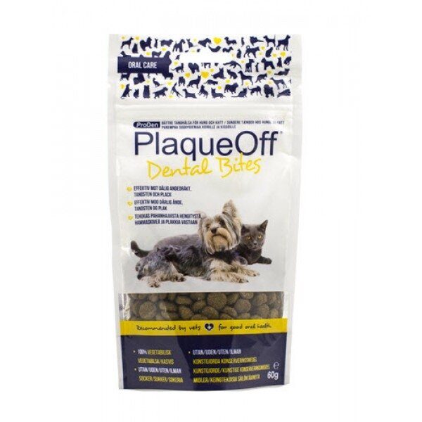 PlaqueOff™ Dental Bites se používají k odstranění a prevenci zápachu z tlamy, zubního plaku a zubního kamene. Podávají se jako pamlsek nebo odměna. PlaqueOff™ je k dostání také jako prášek, který se nasype přímo na krmení. Tyto dva výrobky můžete mezi sebou dobře kombinovat.