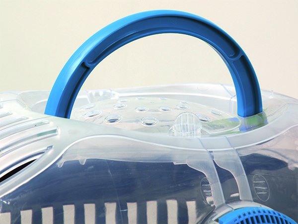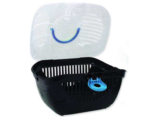 Plastová přepravka s průhledným vrchním dílem a madlem.