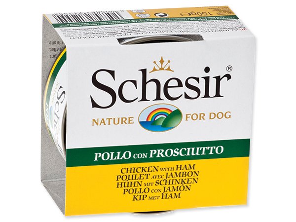 Schesir Dog kuřecí filety se šunkou 150 g je kvalitní krmivo v konzervě pro dospělé psy. Krmivo je vyrobeno jen z kvalitních částí masa, neobsahuje kosti, kůži ani žádné vnitřnosti.