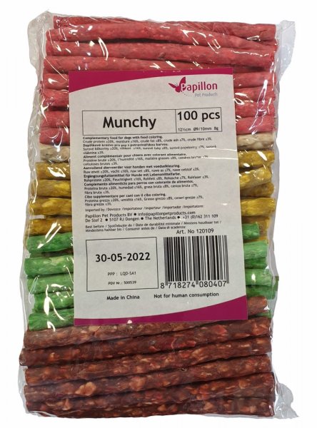 Různé barvy, délka 125mm, prům. 9-10mm. Podporuje posilování žvýkacích svalů a pomáhá přirozeně čistit zuby od zubního plaku. Dbejte, aby pes nehltal velké kusy a aby měl přístup k čerstvé pitné vodě. Není určeno k lidské spotřebě.