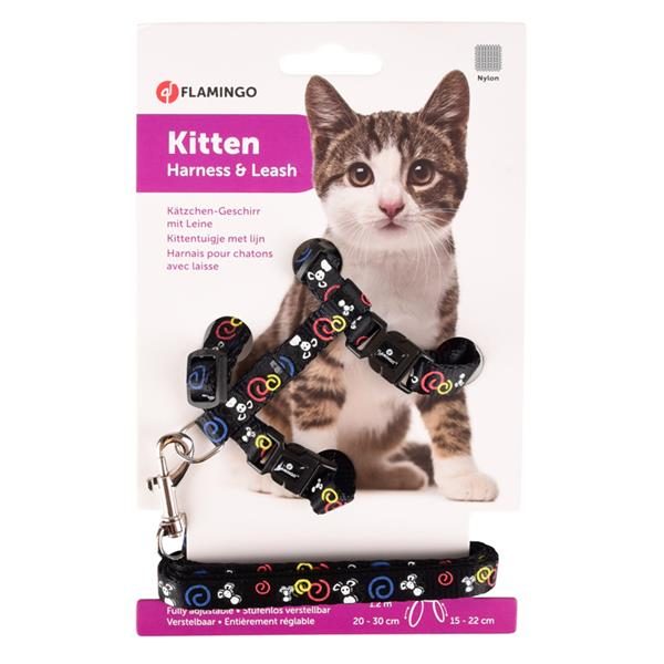 Pohodlný černý postroj s vodítkem pro koťata z nylonu.