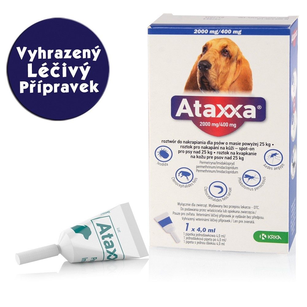 Ataxxa Spot-on Dog XL 2000 mg / 400 mg (1×4 ml) je antiparazitní přípravek pro psy nad 25 kg určený k ochraně proti blechám a dalším vnějším parazitům. Kombinace účinných látek imidacloprid a permethrin působí rychle a spolehlivě – blechy jsou usmrceny do 24 hodin po aplikaci a jednorázové podání chrání psa před dalším napadením až po dobu 4 týdnů. Přípravek lze použít také jako součást léčby alergie na bleší kousnutí (FAD).