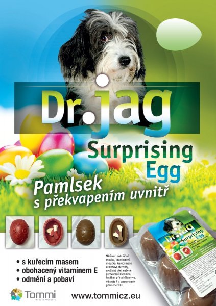 Pamlsek pro psy ve tvaru vajíčka s překvapením uvnitř. - překvapení: drobné pamlsky ve tvaru kostiček a srdíček