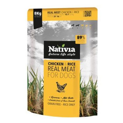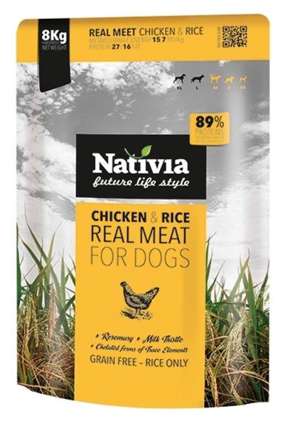 Receptura respektuje přirozené zákonitosti výživy psa. Obvyklá kombinace obilovin či brambor je zcela nahrazena pouze kvalitní rýží. Ta svojí stravitelností a profilem aminokyselin tyto tradiční suroviny převyšuje, nezatěžuje organismus a společně s ostatními komponentami výrobku zajistí zdravou výživu psa. Nativia REAL MEAT chicken&rice obsahuje 89% bílkovin živočišného původu a řadí se tak mezi přední značky na trhu.