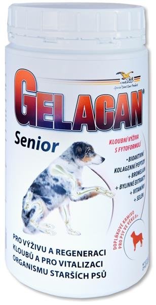 Koubní výživa s kolagenem a bylinnými extrakty NOVINKA Gelacan® Senior obsahuje kolagenní peptidy CHP které zvyšují syntézu kolagenu, vyživují a regenerují kloubní chrupavky, šlachy, vazy a kosti a zmírňují, až odstraňují tak následky předchozí nedostatečné výživy nebo poškození kloubů, zabraňují dalšímu úbytku chrupavek, zlepšují hybnost a zmírňují bolestivost.