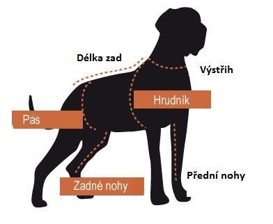 Výběr velikosti: změřte stojícího pejska od kohoutku mezi lopatkami až ke kořeni ocásku. Vyberte pak nejbližší velikost oblečku míře, kterou jste naměřili. Například, naměřili jste 62cm délku zad volte velikost oblečku 60cm.