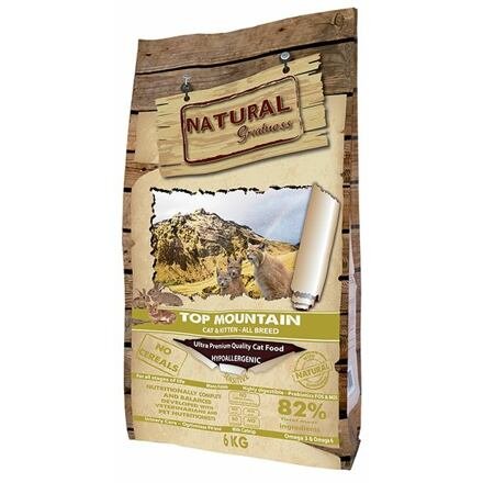 Celkový podíl masa je 82%. Vynikající hypoalergenní receptura je formulována tak, aby vyhovovala nutričním potřebám všech plemen koček ve všech fázích života. Natural Greatness Top Mountain Cat Recipe obsahuje vysoké procento kvalitního králičího masa a nízký obsah sacharidů. Toto složení zajišťuje vysokou úroveň vhodných bílkovin pro koťata i dospělé kočky a pomáhá udržovat energii a svalovou hmotu. Receptura BEZ OBILOVIN a LAKTÓZY. BEZ UMĚLÝCH BARVIV, ZVÝRAZŇOVAČŮ CHUTĚ A UMĚLÝCH KONZERVAČNÍCH LÁTEK.