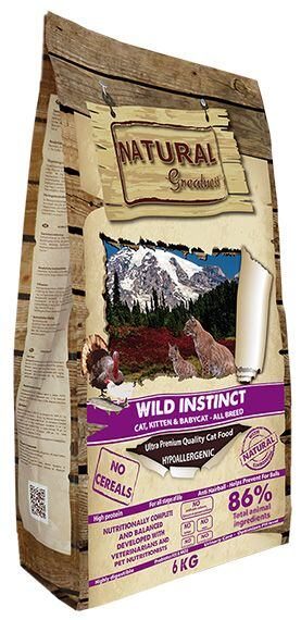 Celkový podíl masa je 86%. Vynikající hypoalergenní receptura je formulována tak, aby vyhovovala nutričním potřebám všech plemen koček ve všech fázích života. Natural Greatness Wild Instinct Cat Recipeobsahuje vysoké procento kvalitního kuřecího a krůtího masa a nízký obsah sacharidů. Toto složení zajišťuje vysokou úroveň vhodných bílkovin pro koťata i dospělé kočky a pomáhá udržovat energii a svalovou hmotu. Receptura BEZ OBILOVIN a LAKTÓZY. BEZ UMĚLÝCH BARVIV, ZVÝRAZŇOVAČŮ CHUTĚ A UMĚLÝCH KONZERVAČNÍCH LÁTEK.